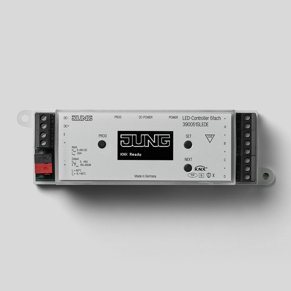 LED-Spots, LED-Stripes, RGB(W), Tunable-White- oder RGB+CCT-Leuchten: Die JUNG KNX LED-Controller eignen sich ideal für die Steuerung von Niedervolt-LED ohne Steuertrafo mittels Pulsweitenmodulation (PWM). Sie sind sowohl für die Montage auf der Hutschiene als auch für die Installation als Einbaugerät verfügbar. Die Controller sind ideal für die Ambientebeleuchtung im Heimbereich geeignet. Doch auch kleine Geschäfte, Restaurants oder Hotels profitieren von den KNX LED-Controllern 5-fach.